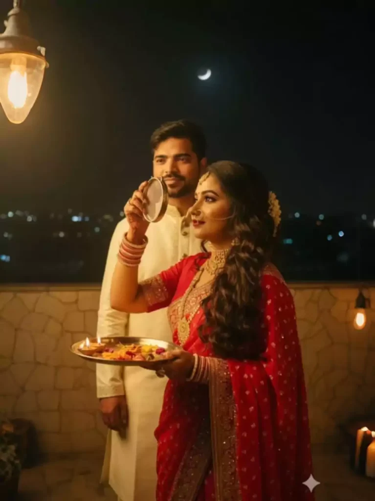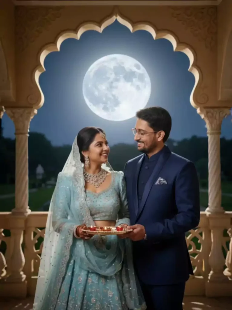 Karwa Chauth night celebration, couple on terrace with diyas and full moon, elegant photography, traditional vibe