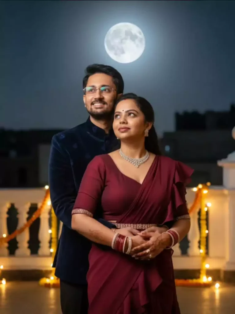 For Karwa Chauth, prompts usually focus on traditional outfits, romantic moods, moonlight settings, and vibrant Indian cultural elements. These prompts help you create aesthetic photos that reflect the spirit of the festival.