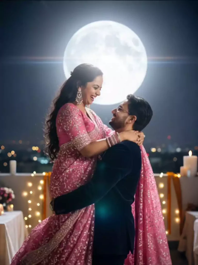 A Husband in velvet navy suit lifting wife in rani pink shimmer saree, both smiling under the glowing moon. Her earrings and bangles sparkle in moonlight. Rooftop decorated with fairy lights, blurred city skyline behind them. Cinematic dramatic lens flare from moon, romantic Bollywood vibe. 8K hyper-realistic vertical fashion-magazine shot.make cinematic light and soft moon light glow. A soft light focus on their face make a cinematic glow.