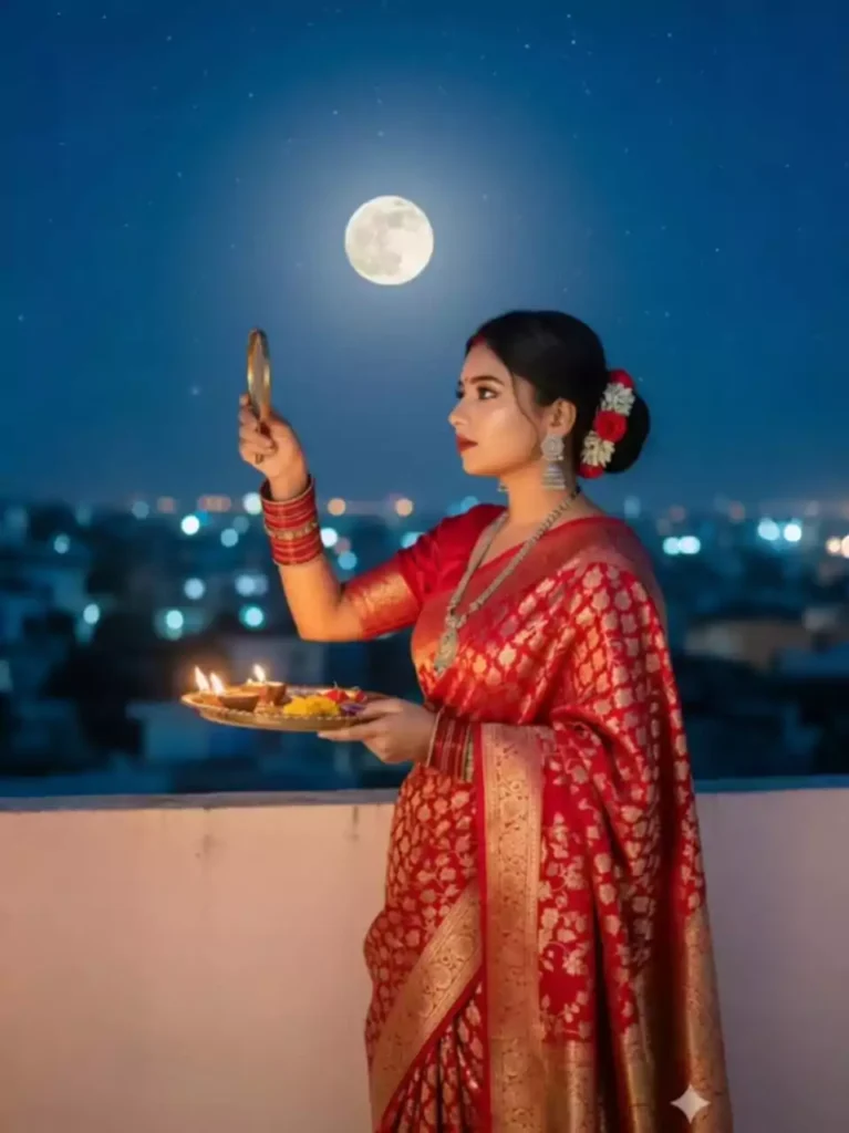 "A beautiful young Indian woman in a vibrant red saree is performing the Karva Chauth ritual on a rooftop. She is looking at the full moon through a sieve, while holding a puja thali with lit diyas and flowers. The nig sky is deep blue, with a bright, luminous moon and twinkling star The background shows the city skyline." Face same to same precent same